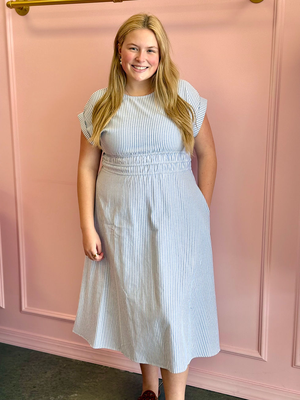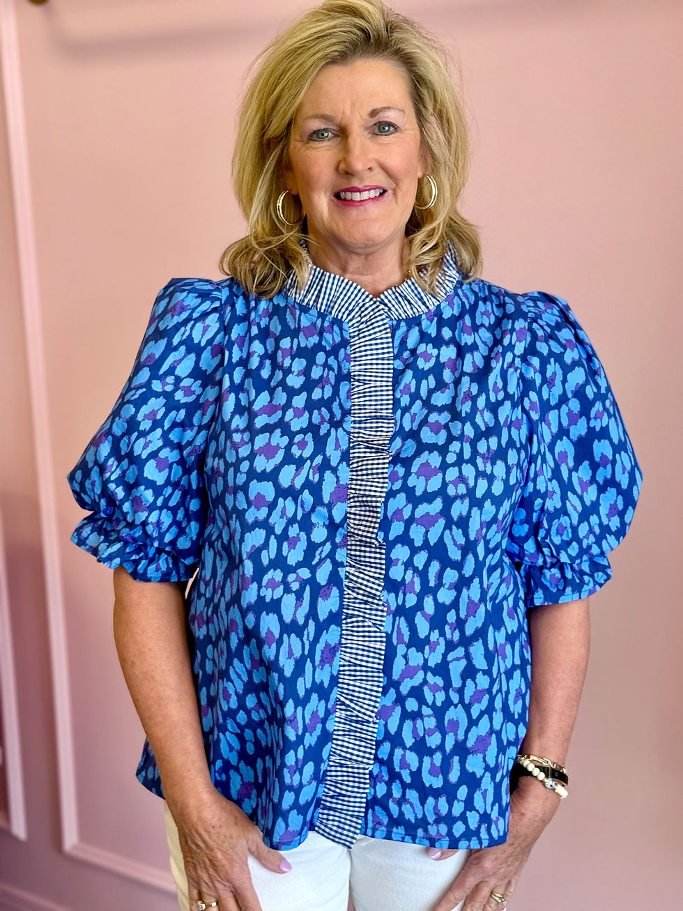 The Gianna Top adds personality to an everyday essential. Designed with a button-front placket, long sleeves with elastic cuffs, and a ruffle neckline, it’s easy to wear and full of charm. Pair it with your favorite denim for laid-back days or style it with tailored pieces for a dressed-up look that still feels effortless.